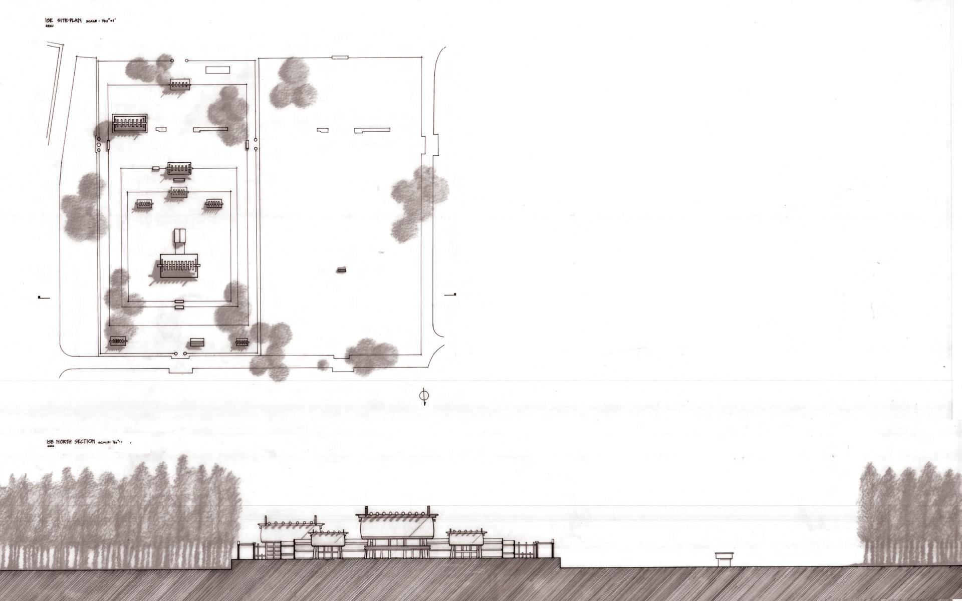 The drawing is pen on vellum with an underlay of graphite shadows…and the composition portrays the order inherent in the subject at hand…tracing footsteps of the solid-void relationship these spatial carvings leave in the forests of Ise.