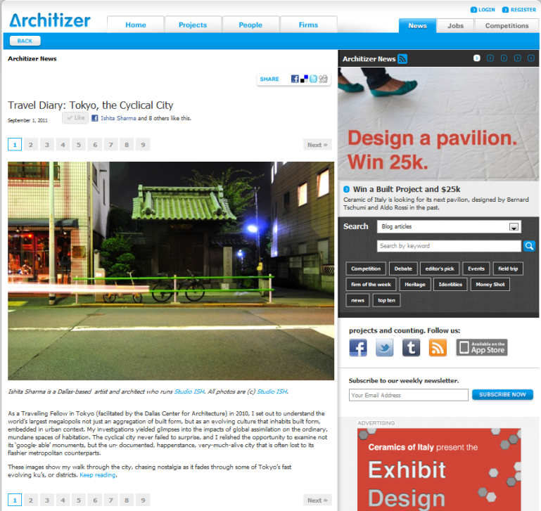 Meandering through the streets of Tokyo, by yours truly. A very brief photo-essay for Architizer based on my Traveling Fellowship to Tokyo in October 2010…hope you enjoy the escapades!