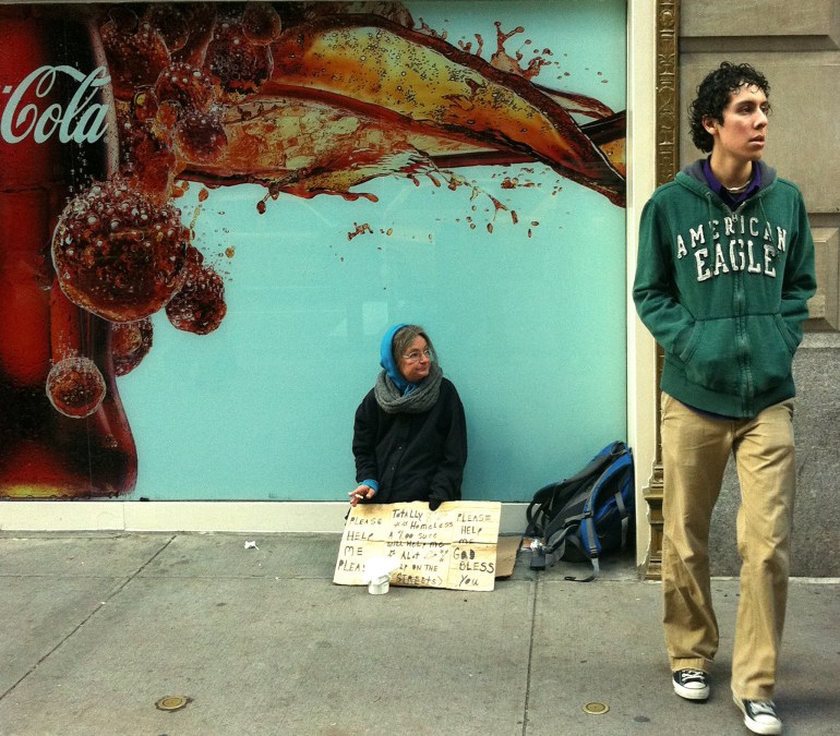 Somehow, the cigarettes, the backpack, the reading glasses and that vacant stare just don’t compare to her counterparts lining the streets of say, Mumbai…poverty redefined in New York City. Or is that being politically incorrect?