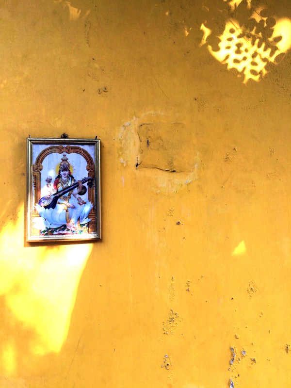 I found Saraswati- the Goddess of wisdom and learning, art and music- on the streets of India, surrounded by the shadow of my beloved Amaltaas leaves…Golden Shower flowers that burst into yellow in the spring, adorning the streets of Delhi. And that too on a yellow wall. The most beautiful Indian Yellow, on a wall that has lived…pardon me, is living. Breathing in the streets.